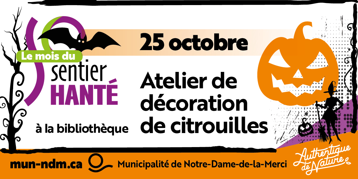 25 octobre 10h à 13h à la bibliothèque, viens nous rejoindre pour créer de magnifiques citrouilles qui seront exposées dans le sentier hanté le 31 octobre. Tu peux apporter ta citrouille, mais il y en aura quelques unes de disponible pour toi si tu n'en n'as pas. Plaisir garanti !