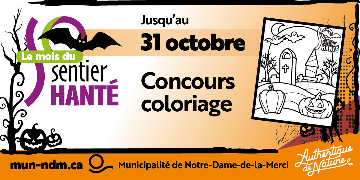 Du 1er au 31 octobre : Télécharge et imprime ce dessin ou procure-toi-le à la réception du bureau municipal ou à la bibliothèque, ajoutes y tes couleurs, puis viens le porter à la réception du bureau municipal. Le coloriage gagnant sera tiré au sort. Date limite pour venir porter ton dessin, vendredi 31 octobre à 16h30, 12 ans et moins. Tirage le 4 novembre.