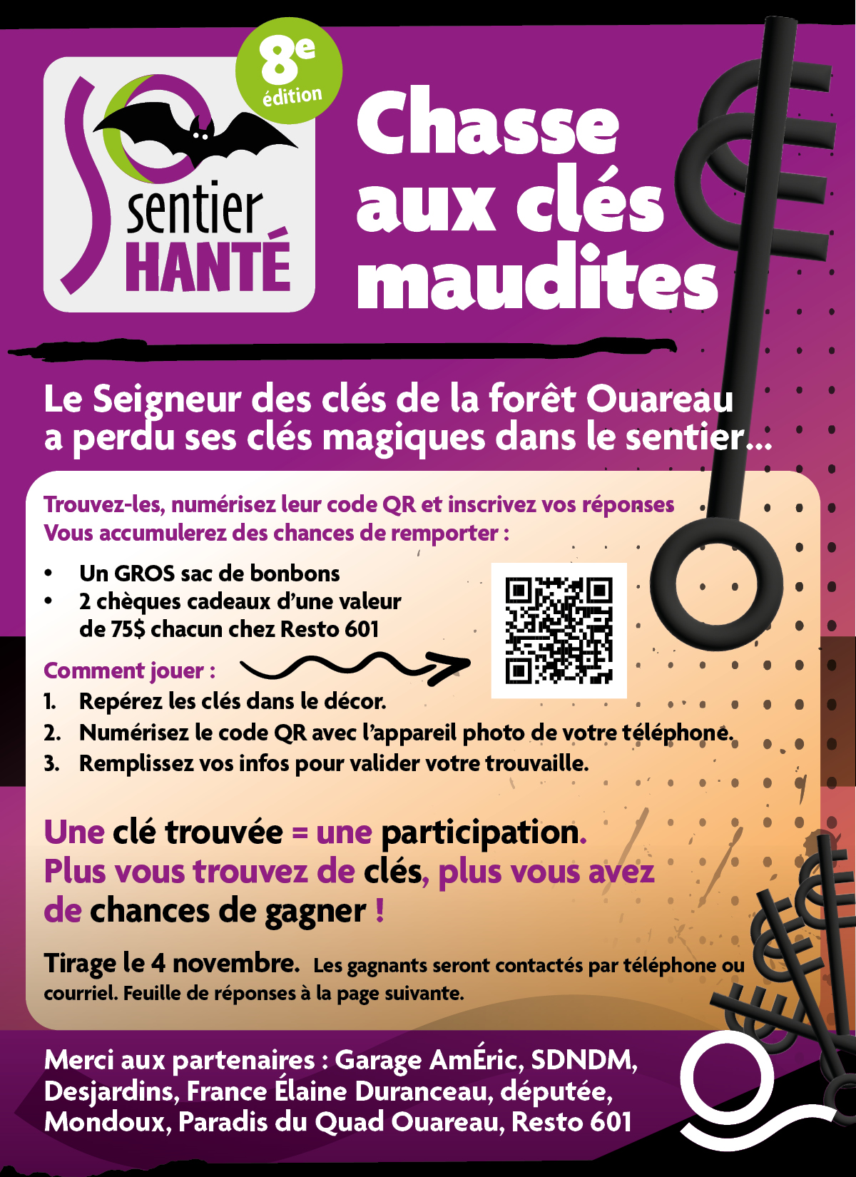 Selon les prévisions météorologiques, de la pluie est annoncée pour le vendredi 31 octobre. Comme cet événement résulte d’un long travail de préparation et que nos équipes sont prêtes à toute éventualité, nous confirmons que le Sentier Hanté aura bel et bien lieu, cependant en version modifiée et adaptée, un chapiteau supplémentaire sera en place et les kiosques seront regroupés. Nous invitons les participant(e)s à prévoir leur costume en conséquence. Pensez à enfiler un imperméable sous votre déguisement, à porter des vêtements chauds et des bottes de pluie afin de profiter pleinement de l’expérience sans craindre les caprices de la météo.
