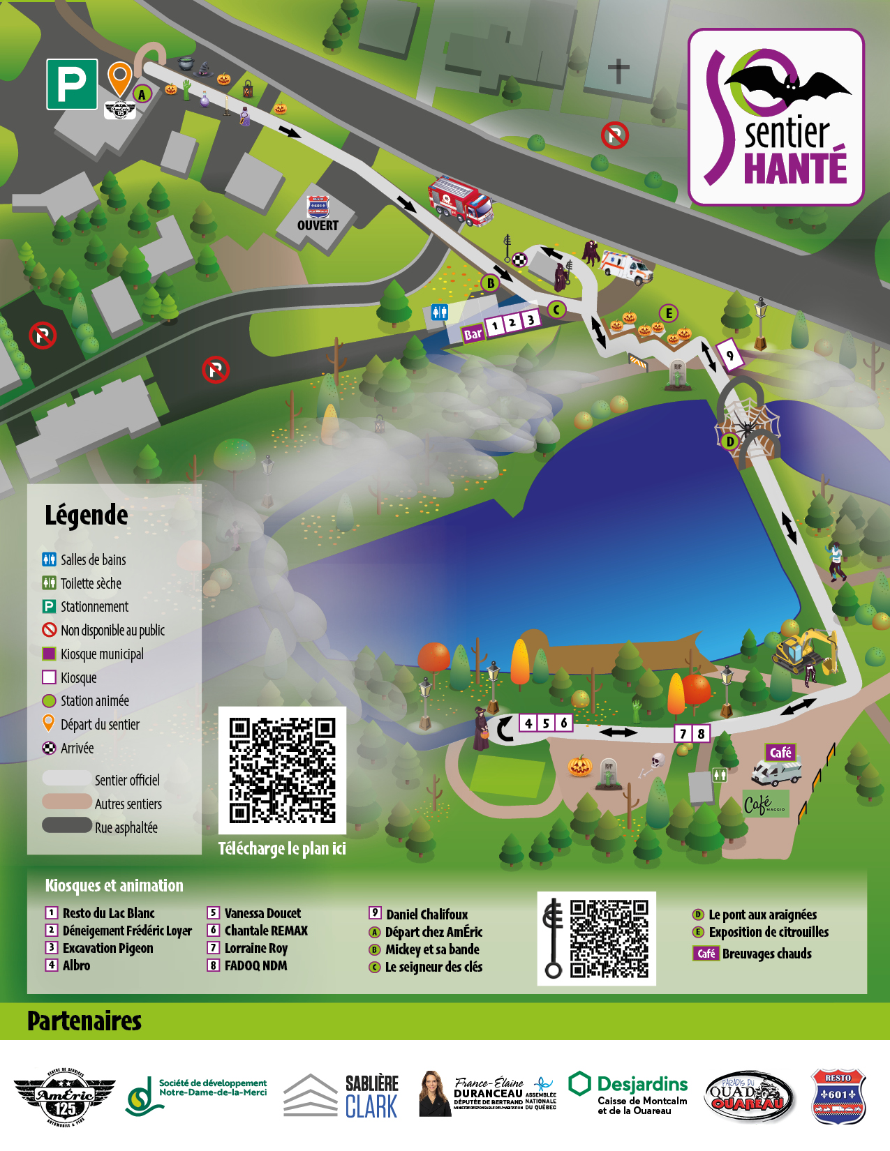 Voici le plan du sentier hanté. Il est téléchargeable en tout temps et sera mis à jour régulièrement. Vous y trouvez le plan du parcours, le départ et l'arrivée, le sens, les indications pour le stationnement, les emplacements des kiosques, les animations et les partenaires.