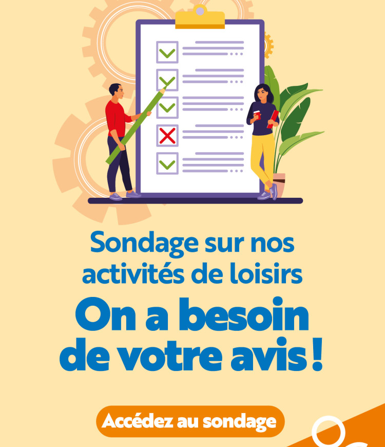 Afin de mieux comprendre vos habitudes et de bonifier notre offre d’activités, le service des loisirs vous invite à répondre à un court questionnaire. Quelques minutes suffisent pour nous aider à orienter la programmation future et à vous proposer des activités qui vous ressemblent.