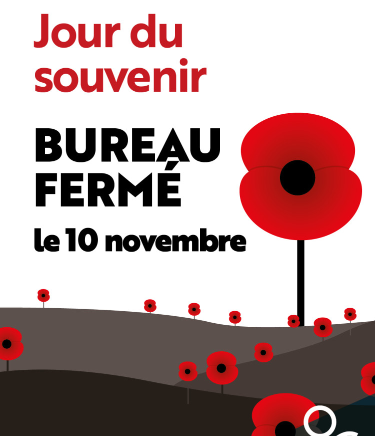 La Municipalité de Notre-Dame-de-la-Merci souhaite informer la population que le bureau municipal sera fermé le lundi 10 novembre à l’occasion du Jour du Souvenir. La Municipalité tient à exprimer ses plus sincères hommages et sa reconnaissance envers les vétérans qui ont servi et défendu nos droits et liberté avec courage et dévouement. Le bureau municipal rouvrira ses portes le mardi 11 novembre aux heures habituelles.