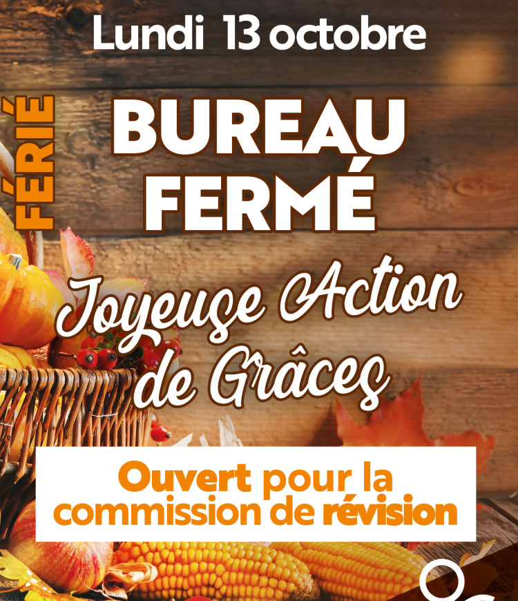Veuillez prendre note que le lundi 13 octobre, le bureau municipal sera fermé pour ce jour férié. Cependant, dans le cadre des élections municipales, il est important de noter que le bureau sera tout de même ouvert pour la commission de révision de 14h à 20h.