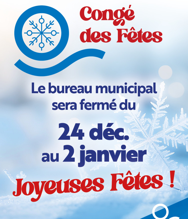 Prenez note que le bureau municipal sera fermé du 24 décembre 2025 au 2 janvier 2026 inclusivement pour le congé du temps des Fêtes. Nous vous souhaitons un Noël des plus chaleureux et une bonne et heureuse année 2026. Toute l'équipe sera de retour le 5 janvier 2026 !