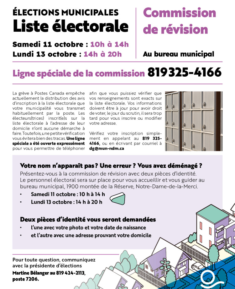 La grève à Postes Canada empêche actuellement la distribution des avis d’inscription à la liste électorale que votre municipalité vous transmet habituellement par la poste. Pour pallier à ce problème, une ligne spéciale a été ouverte expressément pour vous permettre de vérifier l'exactitude de vos renseignements sur la liste électorale. Si vos informations ne sont pas à jour, vous ne pourrez pas exercer votre droit de vote le jour du scrutin. Ne prenez pas de risque et vérifiez vos informations simplement en appelant au 819 325-4166, ou en écrivant par courriel à dg@mun-ndm.ca